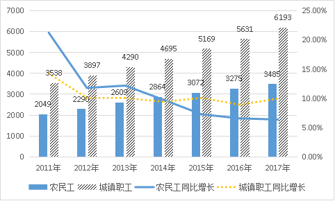 數(shù)據(jù)來源:根據(jù)《2011—2017年度人力資源和社會(huì)保障事業(yè)發(fā)展統(tǒng)計(jì)公報(bào)》《2011—2017國家統(tǒng)計(jì)局農(nóng)民工監(jiān)測調(diào)查報(bào)告》整理
