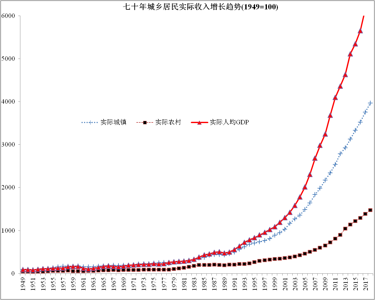 圖5:70年來城鄉(xiāng)居民實(shí)際收入增長趨勢