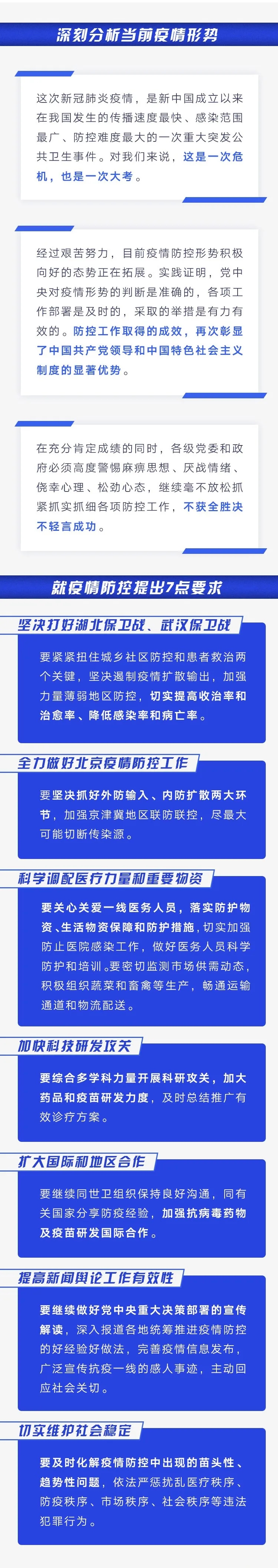 習(xí)近平強(qiáng)調(diào),在充分肯定成績的同時(shí),各級黨委和政府必須高度警惕麻痹思想、厭戰(zhàn)情緒、僥幸心理、松勁心態(tài),繼續(xù)毫不放松抓緊抓實(shí)抓細(xì)各項(xiàng)防控工作,不獲全勝決不輕言成功。習(xí)近平提出7點(diǎn)要求。第一,堅(jiān)決打好湖北保衛(wèi)戰(zhàn)、武漢保衛(wèi)戰(zhàn)。要緊緊扭住城鄉(xiāng)社區(qū)防控和患者救治兩個(gè)關(guān)鍵,堅(jiān)決遏制疫情擴(kuò)散輸出,加強(qiáng)力量薄弱地區(qū)防控,切實(shí)提高收治率和治愈率、降低感染率和病亡率。第二,全力做好北京疫情防控工作。要堅(jiān)決抓好外防輸入、內(nèi)防擴(kuò)散兩大環(huán)節(jié),加強(qiáng)京津冀地區(qū)聯(lián)防聯(lián)控,盡最大可能切斷傳染源。第三,科學(xué)調(diào)配醫(yī)療力量和重要物資。要關(guān)心關(guān)愛一線醫(yī)務(wù)人員,落實(shí)防護(hù)物資、生活物資保障和防護(hù)措施,切實(shí)加強(qiáng)防止醫(yī)院感染工作,做好醫(yī)務(wù)人員科學(xué)防護(hù)和培訓(xùn)。要密切監(jiān)測市場供需動(dòng)態(tài),積極組織蔬菜和畜禽等生產(chǎn),暢通運(yùn)輸通道和物流配送。第四,加快科技研發(fā)攻關(guān)。要綜合多學(xué)科力量開展科研攻關(guān),加大藥品和疫苗研發(fā)力度,及時(shí)總結(jié)推廣有效診療方案。第五,擴(kuò)大國際和地區(qū)合作。要繼續(xù)同世衛(wèi)組織保持良好溝通,同有關(guān)國家分享防疫經(jīng)驗(yàn),加強(qiáng)抗病毒藥物及疫苗研發(fā)國際合作。第六,提高新聞輿論工作有效性。要繼續(xù)做好黨中央重大決策部署的宣傳解讀,深入報(bào)道各地統(tǒng)籌推進(jìn)疫情防控的好經(jīng)驗(yàn)好做法,完善疫情信息發(fā)布,廣泛宣傳抗疫一線的感人事跡,主動(dòng)回應(yīng)社會關(guān)切。第七,切實(shí)維護(hù)社會穩(wěn)定。要及時(shí)化解疫情防控中出現(xiàn)的苗頭性、趨勢性問題,依法嚴(yán)懲擾亂醫(yī)療秩序、防疫秩序、市場秩序、社會秩序等違法犯罪行為。