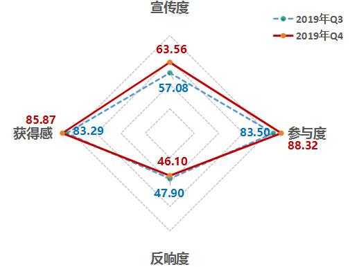 第四,從四個維度來看,宣傳度得分63.56,參與度得分88.32,反響度得分46.10,獲得感得分85.87。反響度較低,參與度相對較高。與三季度相比,宣傳度顯著提升,反響度有所下降;
