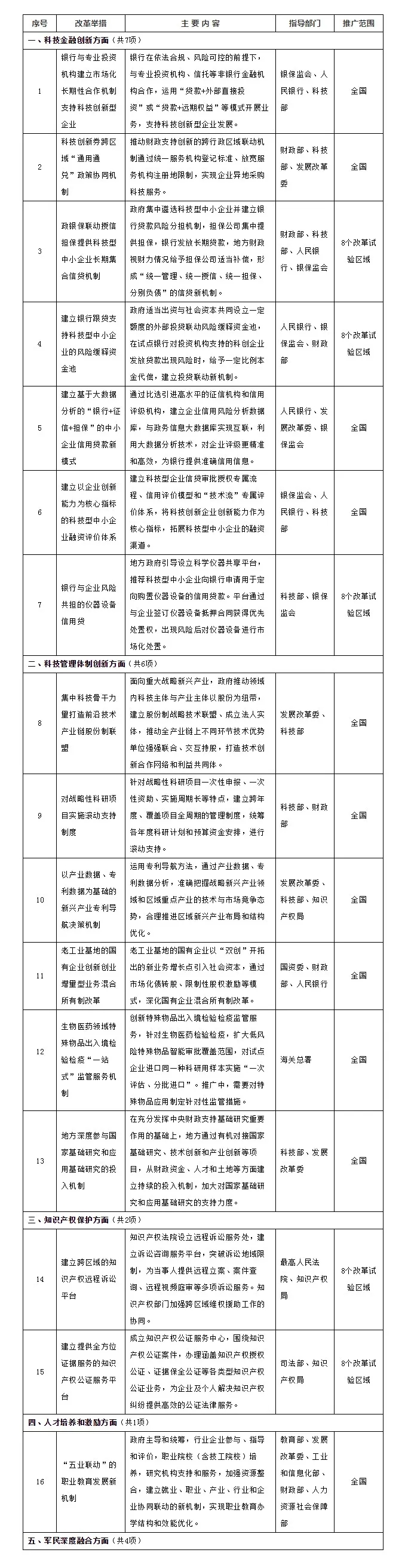 本次正式發(fā)布的20項改革舉措,是繼2017年首批13項、2018年第二批23項之后,由國辦發(fā)布的第3批向全國或在8個試驗區(qū)域范圍內(nèi)復(fù)制推廣、支持創(chuàng)新的改革舉措,涵蓋了科技金融創(chuàng)新、科技管理體制創(chuàng)新、知識產(chǎn)權(quán)保護、人才培養(yǎng)和激勵和軍民深度融合5個重點領(lǐng)域。根據(jù)我們觀察分析,經(jīng)過了前期的沉淀,以及進一步的實踐探索,改革進一步走向“深處”和“實處”,這批舉措緊密呼應(yīng)當(dāng)前中央的重要改革關(guān)切,充分體現(xiàn)了“實”和“新”,在一些改革的“老大難”問題上進一步破題。