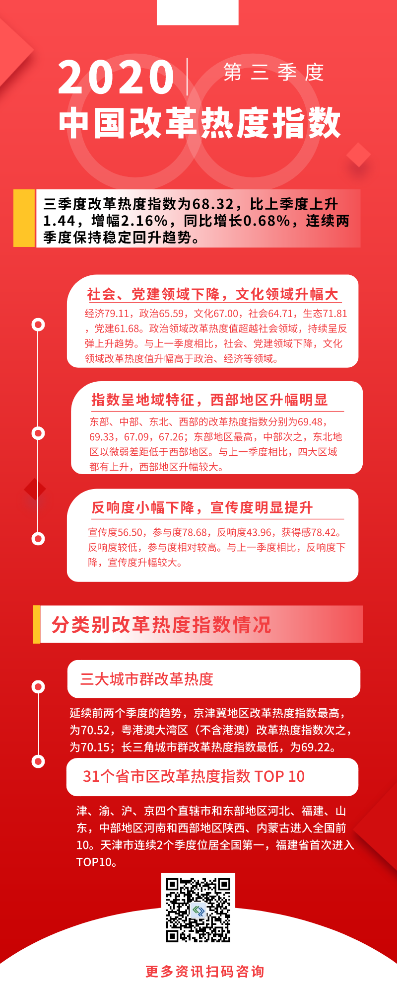 2018年11月25日,中國經(jīng)濟(jì)體制改革研究會(huì)在“第十六屆中國改革論壇”上首次發(fā)布《改革熱度指數(shù)——中國改革熱度第三方評(píng)估報(bào)告》,發(fā)布內(nèi)容為2018年第三季度中國改革熱度指數(shù),具體包括我國整體指數(shù)以及分省、分地區(qū)、分城市、分領(lǐng)域、分維度指數(shù),并將改革熱度指數(shù)總體報(bào)告呈送中央深改委,同時(shí)向各省深改委,以及有需求的城市改革辦提供各自熱度指數(shù)詳情報(bào)告。