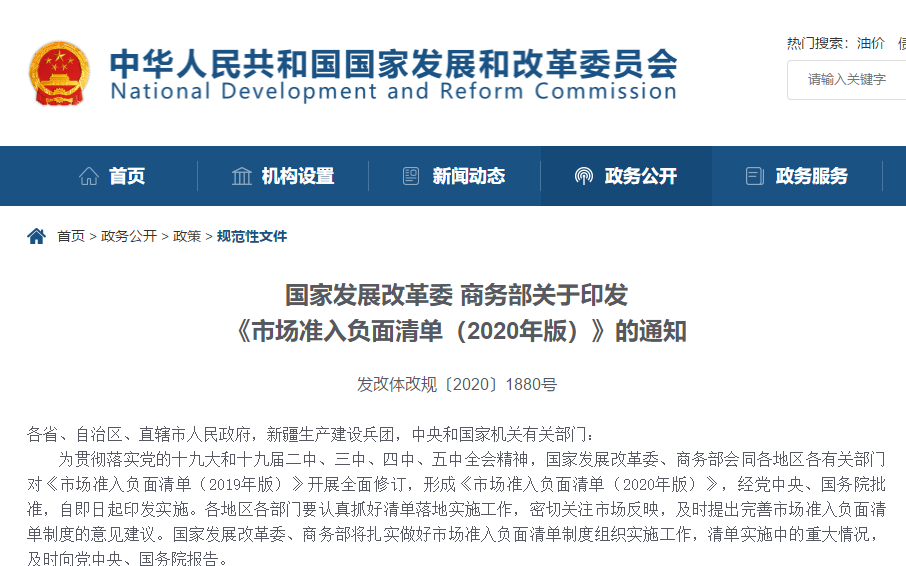國家發(fā)展改革委新聞發(fā)言人孟瑋表示,從2018年12月正式發(fā)布全國統(tǒng)一的市場準(zhǔn)入負(fù)面清單以來,通過三年落地實施,已經(jīng)實現(xiàn)了在全國范圍確立了市場準(zhǔn)入環(huán)節(jié)的負(fù)面清單管理模式。清單之外的行業(yè)、領(lǐng)域、業(yè)務(wù)等,市場主體可以依法平等進(jìn)入,實現(xiàn)“非禁即入”。
