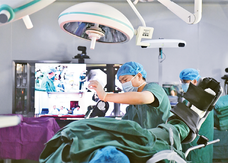 數(shù)字技術與醫(yī)療、農業(yè)、能源、建筑、服務業(yè)等緊密結合,正在推動傳統(tǒng)產業(yè)日益高端化、智能化。圖為2021年4月19日,拉薩市人民醫(yī)院骨科醫(yī)生在北京積水潭醫(yī)院專家遠程指導下,使用骨科機器人開展骨科手術?!⌒氯A社記者 孫瑞博 /攝
