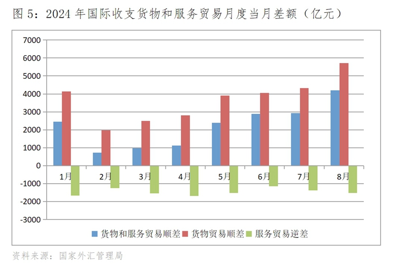 (四)國際收支貨物和服務(wù)貿(mào)易順差總體逐月增加,貨物貿(mào)易順差的增加是主因。1月份,國際收支貨物和服務(wù)貿(mào)易順差實現(xiàn)了高開,達到了2459億元,2月份回落到724億元,但從2月份開始國際收支貨物和服務(wù)貿(mào)易順差逐月增加, 8月份達4203億元,比2月份增加了3479億元。