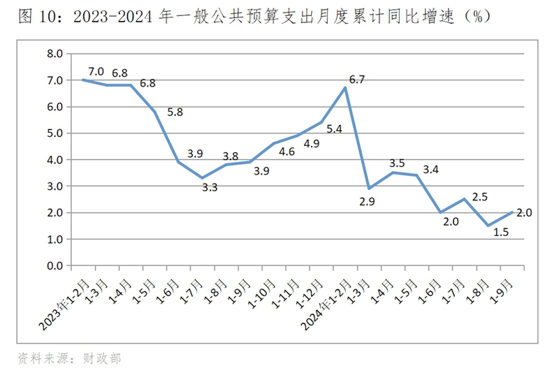 (四)財政支出增速在低速波動中走低,9月份略有回升。財政支出增速年初也是高開,1-2月份財政支出同比增長6.7%,1-3月份回落到增長2.9%,隨后就在低速波動中趨勢性回落,1-9月份增長2.0%。需要特別指出的是,如果按月度增速計算的話,財政支出增速波動會更大一些。