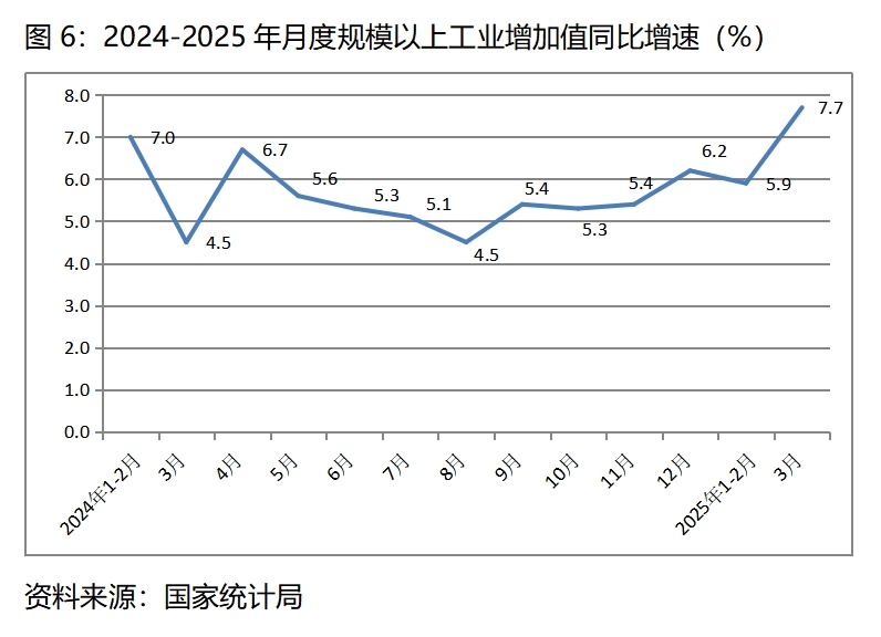 (一)工業(yè)生產(chǎn)增速比上年全年和上年同期均保持回升。一季度規(guī)模以上工業(yè)增加值同比增長6.5%,比上年全年增長5.8%回升0.7個百分點,比上年同期增長6.1%回升0.4個百分點。其中,3月份規(guī)模以上工業(yè)生產(chǎn)增長7.7%,不僅比1-2月份增速有明顯的回升,而且也是近幾年以來月度規(guī)模以上工業(yè)生產(chǎn)增長最快的一個月份。