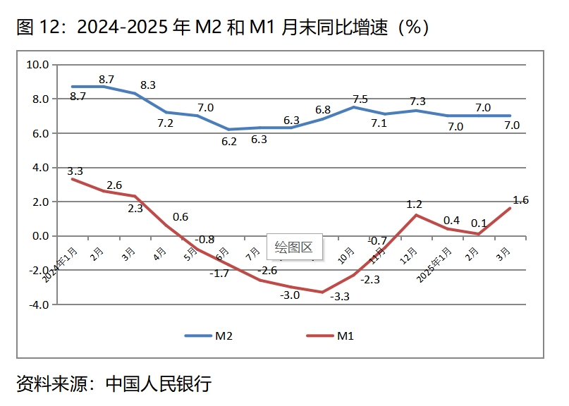 (三)廣義貨幣供應(yīng)量(M2)增速比上年全年和上年同期均保持回落,狹義貨幣供應(yīng)量(M1)增長仍比較緩慢。3月末,廣義貨幣供應(yīng)量同比增長7.0%,比上年年底增長7.3%回落了0.3個百分點,比上年同期增長8.3%回落1.3個百分點,并且已連續(xù)3個月保持了7.0%的增速;3月末,狹義貨幣供應(yīng)量同比增長1.6%,比上年年底增長1.2%回升了0.4個百分點,比上年同期增長2.3%回落0.7個百分點。從實現(xiàn)經(jīng)濟的穩(wěn)定增長和價格的合理上漲要求看,貨幣供應(yīng)量增速確實還是有些緩慢。