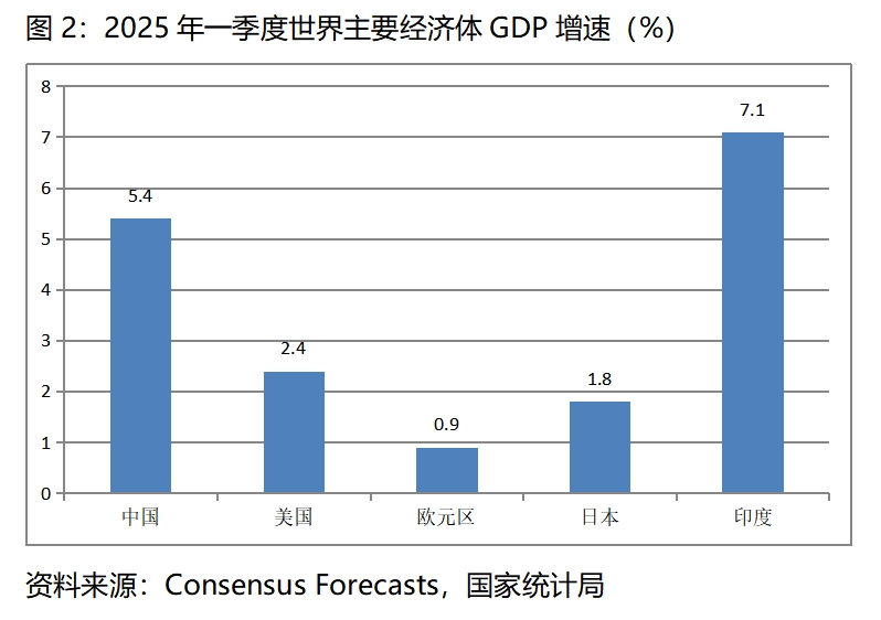 5.4%的經(jīng)濟增速在世界上是比較快的增速。根據(jù)Consensus Forecasts 最新預(yù)測數(shù)據(jù),今年一季度美國GDP同比增長2.4%,歐元區(qū)增長0.9%,日本增長1.8%,印度增長7.1%,我國仍然是世界主要經(jīng)濟體中經(jīng)濟增長比較快的國家。