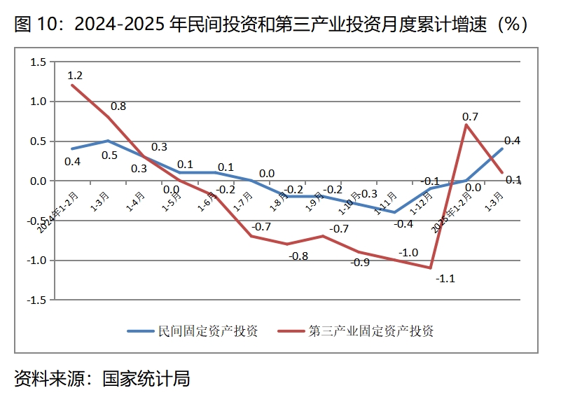 (一)民間投資和第三產(chǎn)業(yè)投資增長仍比較緩慢,增速比上年全年和上年同期均變化不大。一季度民間固定資產(chǎn)投資同比增長0.4%,上年全年為下降0.1%,比上年同期增長0.5%回落0.1個百分點;一季度第三產(chǎn)業(yè)固定資產(chǎn)投資同比增長0.1%,上年全年為下降1.1%,比上年同期增長0.8%回落0.7個百分點。這說明民營經(jīng)濟和第三產(chǎn)業(yè)生產(chǎn)經(jīng)營活力還比較弱。
