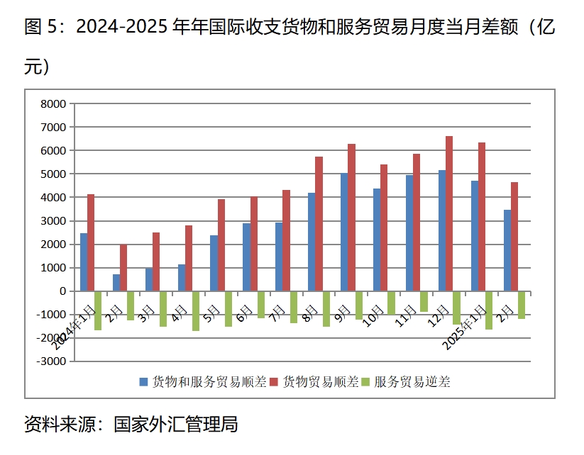 (四)國際收支貨物和服務(wù)貿(mào)易順差增加。今年1月份國際收支貨物和服務(wù)貿(mào)易順差4711億元,比上年同月的2459億元增加2252億元;2月份順差3459億元,比上年同月的724億元增加2735億元,國際收支貨物和服務(wù)貿(mào)易繼續(xù)保持多年以來順差的態(tài)勢,同時今年以來的順差比上年同期增加較多。國際收支貨物和服務(wù)順差中,貨物貿(mào)易繼續(xù)保持順差,服務(wù)貿(mào)易仍然保持逆差。1月份國際收支貨物貿(mào)易順差6342億元,服務(wù)貿(mào)易逆差1631億元;2月份國際收支貨物貿(mào)易順差4638億元,服務(wù)貿(mào)易逆差1178億元。在國際環(huán)境趨于更加復(fù)雜嚴(yán)峻形勢下,國際收支貨物和服務(wù)貿(mào)易仍實現(xiàn)較大順差,充分說明我國經(jīng)濟有著較強的韌性和回旋空間。
