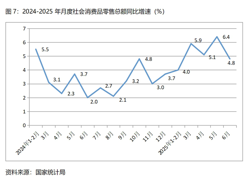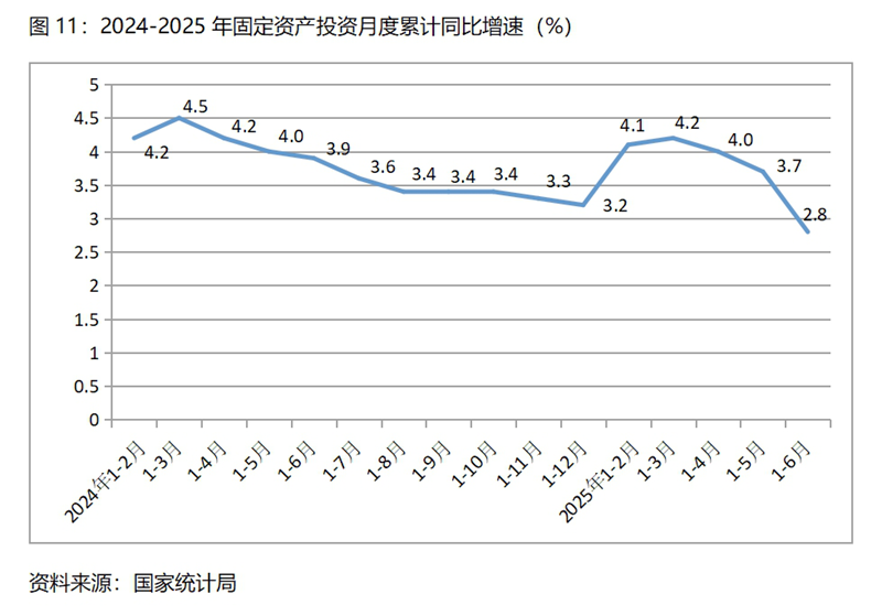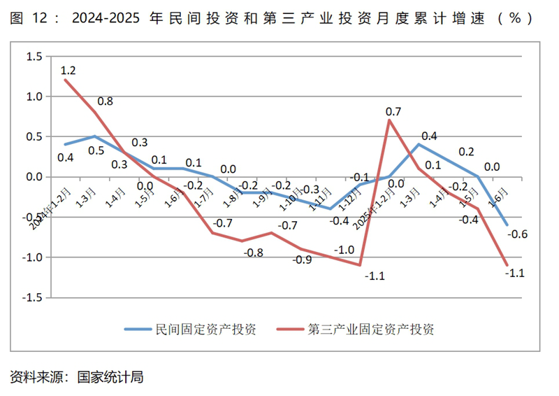 (二)民間投資和第三產業(yè)投資增速均由增長轉為下降,餐飲收入增速回落較多。上半年民間固定資產投資同比下降0.6%,一季度為增長0.4%,這是自2023年9月以來月度累計的最大降幅;第三產業(yè)固定資產投資同比下降1.1%,一季度為增長0.1%,這是今年以來月度累計的最大降幅;餐飲收入同比增長4.3%,比一季度增長4.7%回落了0.4個百分點,比上年同期增長7.9%回落3.6個百分點。這些指標增速的變化需引起宏觀調控政策的高度關注。