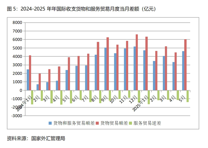(四)國際收支貨物和服務貿易順差持續(xù)增加。今年1月份國際收支貨物和服務貿易順差比上年同月增加2252億元;2月份順差增加2735億元,3月順差增加3093億元,4月順差增加2199億元,5月順差增加2249億元,國際收支貨物和服務貿易順差比上年同期有著明顯的增加。在美國“對等關稅”政策的沖擊下,國際收支貨物和服務貿易仍實現(xiàn)較大的順差,足以說明我國經濟有著較強的國際競爭力。