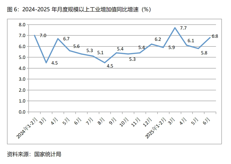 (一)工業(yè)生產增速比一季度略有回落,比上年同期回升。 上半年規(guī)模以上工業(yè)增加值同比增長6.4%,比一季度增長6.5%回落了0.1個百分點,比上年同期增長6.0%回升0.4個百分點。其中,采礦業(yè)同比增長6.0%,比一季度增長6.2%回落了0.2個百分點;制造業(yè)增長7.0%,比一季度增長7.1%回落了0.1個百分點;電力、熱力、燃氣及水生產和供應業(yè)增長1.9%,與一季度持平。