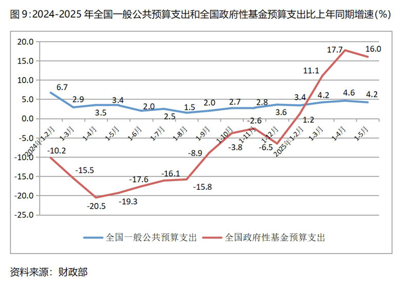 (四)一般公共預算支出增速與一季度持平、比上年同期回升,政府性基金預算支出增速比一季度回升、由上年同期下降轉為增長。1-5月份全國一般公共預算支出同比增長4.2%,與一季度增長4.2%持平,比上年同期增長3.4%回升了0.8個百分點,但增速仍有一些偏慢;全國政府性基金預算支出同比增長16.0%,比一季度增長11.1%回升4.9個百分點,上年同期為下降19.3%,呈現(xiàn)出明顯回升的態(tài)勢。從拉動經濟增長的要求看,特別是在面對微觀經營主體需求不足的形勢下,政府支出還需要更快一些,有必要進一步加大政府支出的力度。