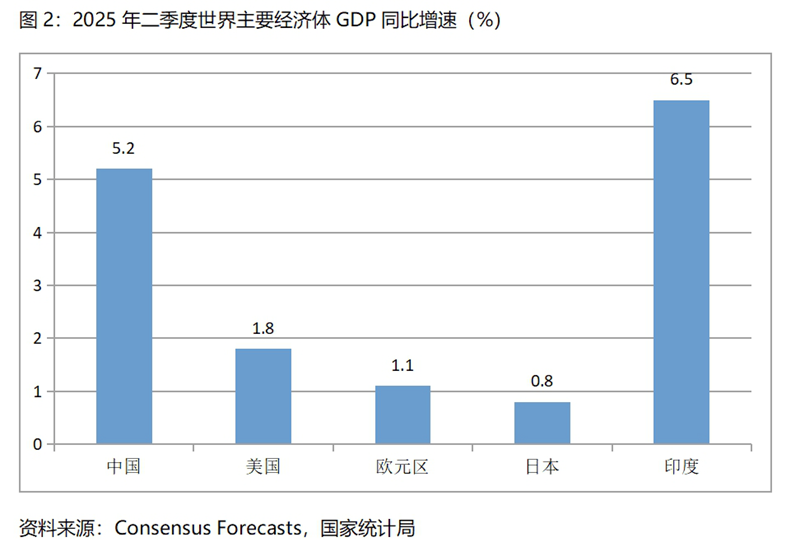 二季度5.2%的經濟增速在世界上是比較快的增速。根據Consensus Forecasts 最新預測數據,今年二季度美國GDP同比將增長1.8%,歐元區(qū)將增長1.1%,日本將增長0.8%,印度將增長6.5%,我國仍然是世界主要經濟體中經濟增長比較快的國家。