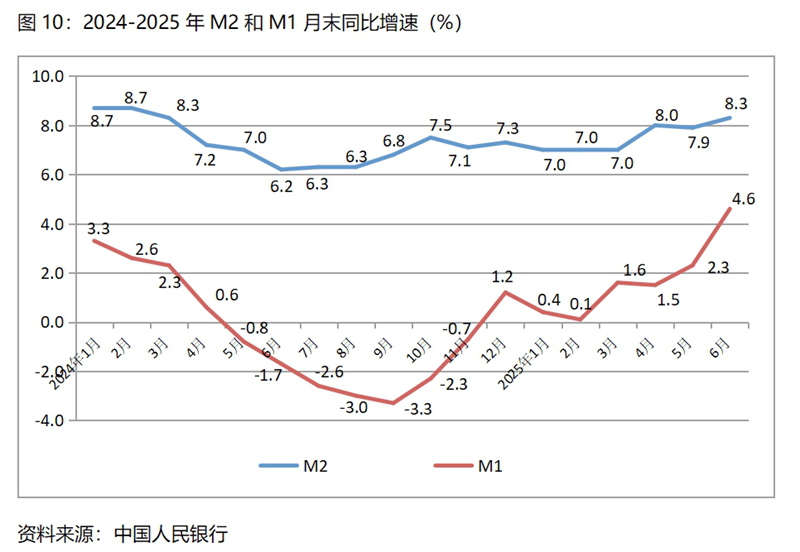 (五)廣義貨幣供應量(M2)增速比一季度末和上年同期均保持回升,狹義貨幣供應量(M1)增速比一季度末和上年同期也均保持回升。6月末,廣義貨幣供應量同比增長8.3%,比一季度末增長7.0%回升了1.3個百分點,比上年同期增長6.2%回升了2.1個百分點,總體保持了今年以來持續(xù)回升的勢頭;6月末,狹義貨幣供應量同比增長4.6%,比一季度末增長1.6%回升了3.0個百分點,而上年同期為下降1.7%。說明今年以來的貨幣政策較好地堅持了適度寬松的方向,為經濟運行提供了較為寬松的流動性,但從微觀經營主體活力不足和價格低位運行看,貨幣政策還有進一步寬松的必要。