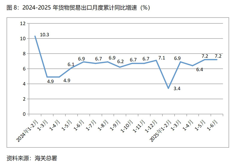 下半年GDP保持4.8%以上的增速,有政策實施、有趨勢慣性以及上年穩(wěn)定基數等因素的支撐。上半年積極的財政政策通過擴大支出、適度寬松貨幣政策通過降準降息、擴大內需通過設備更新和以舊換新等政策措施,在下半年將會繼續(xù)發(fā)揮作用,加之下半年積極財政政策和適度寬松貨幣政策的繼續(xù)實施,“兩重”、“兩新”政策等一系列政策措施的落實,對下半年經濟增長形成了有力支持。上半年GDP的較快增長,對下半年GDP增長發(fā)揮著慣性的作用,加之下半年GDP增長基數與上半年基數均是5.0%,穩(wěn)定的基數有利于下半年GDP增長4.8%以上。