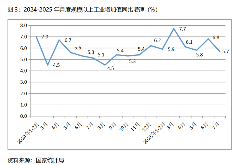 (一)工業(yè)增速由升轉(zhuǎn)落。7月份,規(guī)模以上工業(yè)增加值同比增長5.7%,比上月增長6.8%回落了1.1個百分點,6月份比5月份回升了1.0個百分點。從工業(yè)三大門類看,采礦業(yè)和制造業(yè)增速比上月回落,電力、熱力、燃氣及水生產(chǎn)和供應業(yè)增速回升,7月份采礦業(yè)同比增長5.0%,比上月回落1.1個百分點;制造業(yè)增長6.2%,比上月回落1.2個百分點;電力、熱力、燃氣及水生產(chǎn)和供應業(yè)增長3.3%,比上月回升1.5個百分點。今年以來工業(yè)增速波動的運行,反映出工業(yè)的回升仍缺乏穩(wěn)固的基礎。