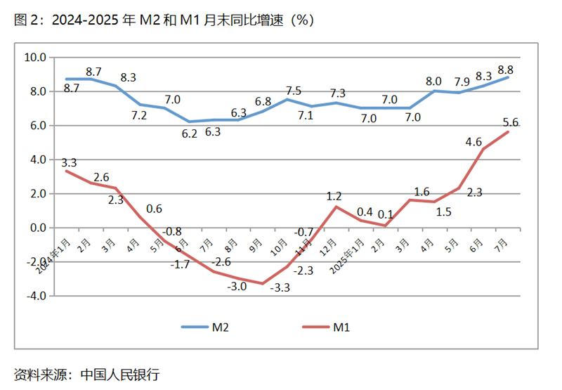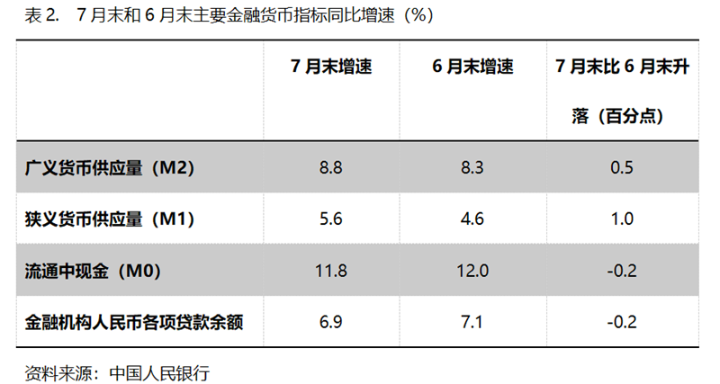 (二)M2增速持續(xù)回升。7月末,廣義貨幣供應量(M2)同比增長8.8%,比6月末增長8.3%回升0.5個百分點,6月末增速比5月末7.9%的增速回升了0.4個百分點,保持了持續(xù)回升勢頭;狹義貨幣供應量(M1)同比增長5.6%,比6月末增長4.6%回升1.0個百分點,6月末增幅比5月末2.3%增幅回升2.3個百分點;流通中貨幣(M0)增速持續(xù)小幅回落,7月末同比增長11.8%,比6月末增長12.0%回落0.2個百分點,而6月末增速比5月末增速回落0.1個百分點。7月末M2和M1增速的持續(xù)回升,M0增速的基本持平,表明貨幣政策仍在向適度寬松方向的要求運行, M1緩慢的增長仍需要給予高度關(guān)注。