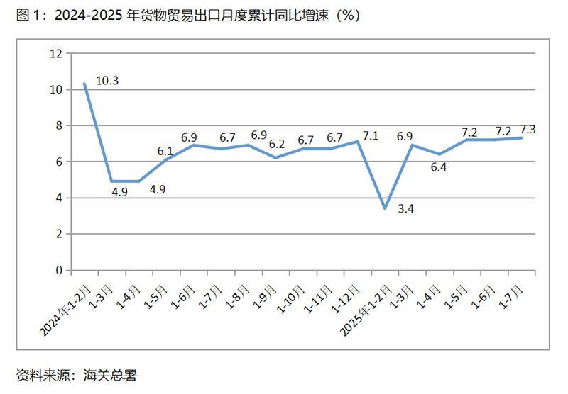 (一)貨物出口增速由平轉(zhuǎn)升。1-7月份,貨物出口同比增長7.3%,比1-6月份增長7.2%回升0.1個百分點,1-6月份與1-5月份持平,增速呈現(xiàn)出由平轉(zhuǎn)升的態(tài)勢。貨物出口對主要貿(mào)易出口經(jīng)濟體增速有升有平也有落,1-7月份對歐盟出口同比增長8.2%,比1-6月份7.9%增速回升0.3個百分點;對美國出口下降11.6%,比1-6月份下降9.9%擴大1.7個百分點;對東盟出口增長14.8%,比1-6月份14.3%增速回升0.5個百分點;對拉丁美洲出口增長8.4%,與1-6月份8.4%增速持平;對非洲出口增長25.9%,比1-6月份23.0%增速回升2.9個百分點。面對較為復雜嚴峻的國際形勢,出口增速由平轉(zhuǎn)升,充分說明我國出口有著較強的韌性。