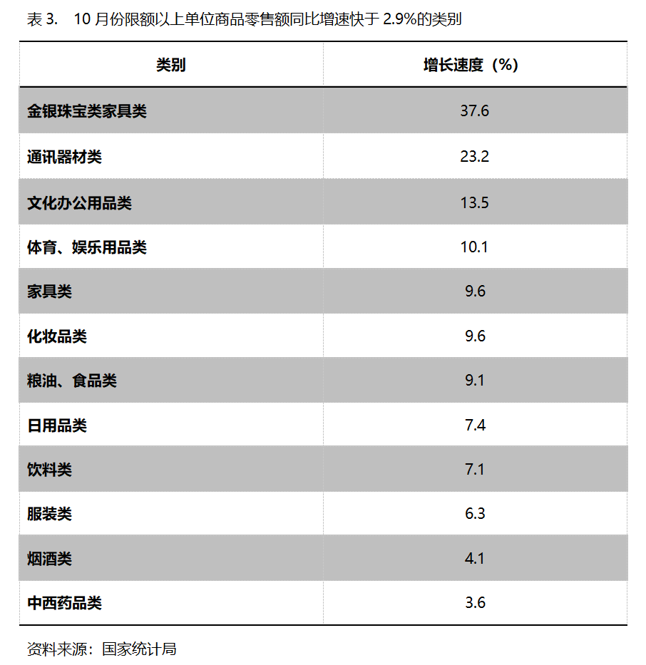10月份,限額以上單位商品零售額同比增速快于社會(huì)消費(fèi)品零售總額2.9%增速的共有12類,即金銀珠寶類增長37.6%,通訊器材類增長23.2%,文化辦公用品類增長13.5%,體育、娛樂用品類增長10.1%,家具類增長9.6%,化妝品類增長9.6%,糧油、食品類增長9.1%,日用品類增長7.4%,飲料類增長7.1%。服裝類增長6.3%。煙酒類增長4.1%,中西藥品類增長3.6%。