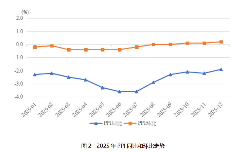 二是PPI呈“V”型走勢,同比繼續(xù)下降。PPI同比下降2.6%,降幅比上年略擴大0.4個百分點。生產(chǎn)資料和生活資料價格同步走低,且降幅較上年同期均有所擴大。其中,生產(chǎn)資料價格同比下降 3%,降幅較上年擴大 0.5 個百分點。從結(jié)構(gòu)上看,生產(chǎn)資料價格變動呈現(xiàn) “上游降幅更深、下游相對較小” 的梯度特征。上游采掘業(yè)價格整體下降9.0%,成為生產(chǎn)資料中降幅最大的品類;中游的原材料工業(yè)價格同比下降3.4%;主要受終端需求不足、產(chǎn)品同質(zhì)化競爭加劇等因素影響,下游的加工工業(yè)價格同比下降2.4%。生活資料中,食品價格下降1.6%,降幅比上年擴大0.5個百分點;衣著價格下降0.1%,降幅與上年持平;一般日用品價格上漲0.8%,漲幅比上年擴大0.8個百分點;耐用消費品價格下降3.3%,降幅比上年擴大1.1個百分點。主要能源行業(yè)價格大幅下降是拖累2025年P(guān)PI走勢的核心因素。其中,煤炭開采和洗選業(yè)價格同比下降15.7%,降幅較上年大幅擴大7.5個百分點。原因一是全球煤炭市場供過于求、國際煤炭價格持續(xù)走低,二是國內(nèi)煤炭行業(yè)產(chǎn)能優(yōu)化調(diào)整、清潔能源替代進程加快,進一步壓低了煤炭價格;石油和天然氣開采業(yè)價格同比下降 9.9%,降幅較上年擴大9.5個百分點,主要受國際地緣政治局勢緩和、全球原油產(chǎn)量增加導(dǎo)致的國際油價下行影響,國內(nèi)成品油價格聯(lián)動調(diào)整,進而傳導(dǎo)至上游開采環(huán)節(jié)。上述兩大能源行業(yè)的價格深度下行,不僅直接拉低了采掘工業(yè)價格,還通過產(chǎn)業(yè)鏈傳導(dǎo)影響了原材料工業(yè)、加工工業(yè)乃至部分生活資料的成本與價格,成為PPI降幅擴大的重要因素。?